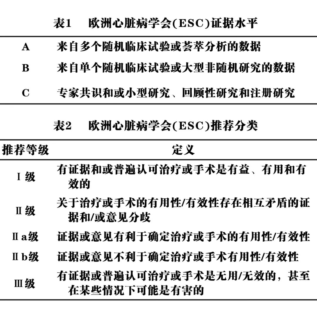 欧洲心脏病学会(European Society of Cardiology,ESC)体系用于对证据和建议进行分级。A、B或C反映了当前证据的级别(表1),每个建议的强度分为Ⅰ、Ⅱa、Ⅱb或Ⅲ级(表2)。