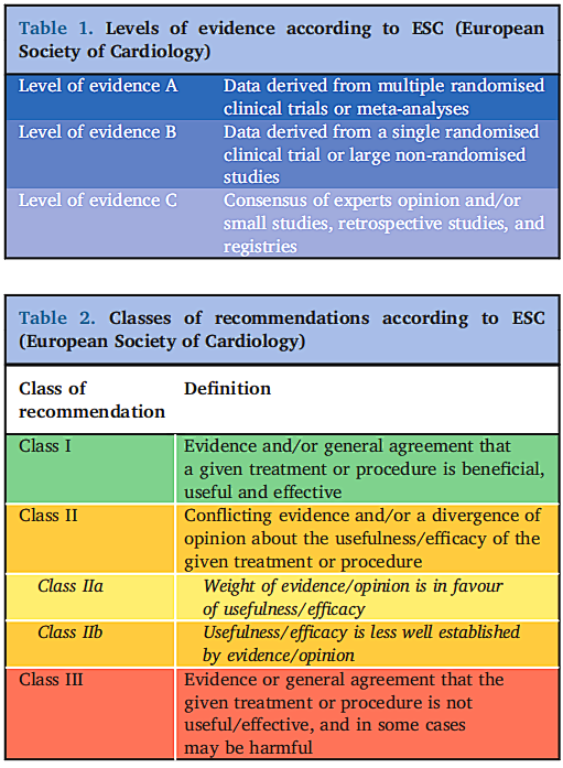 The European Society of Cardiology (ESC) system was used for grading evidence and recommendations. A, B, or C reflects the level of current evidence (Table1) and the strength of each recommendation was then determined to be class I, IIa, IIb, or III (Table 2).