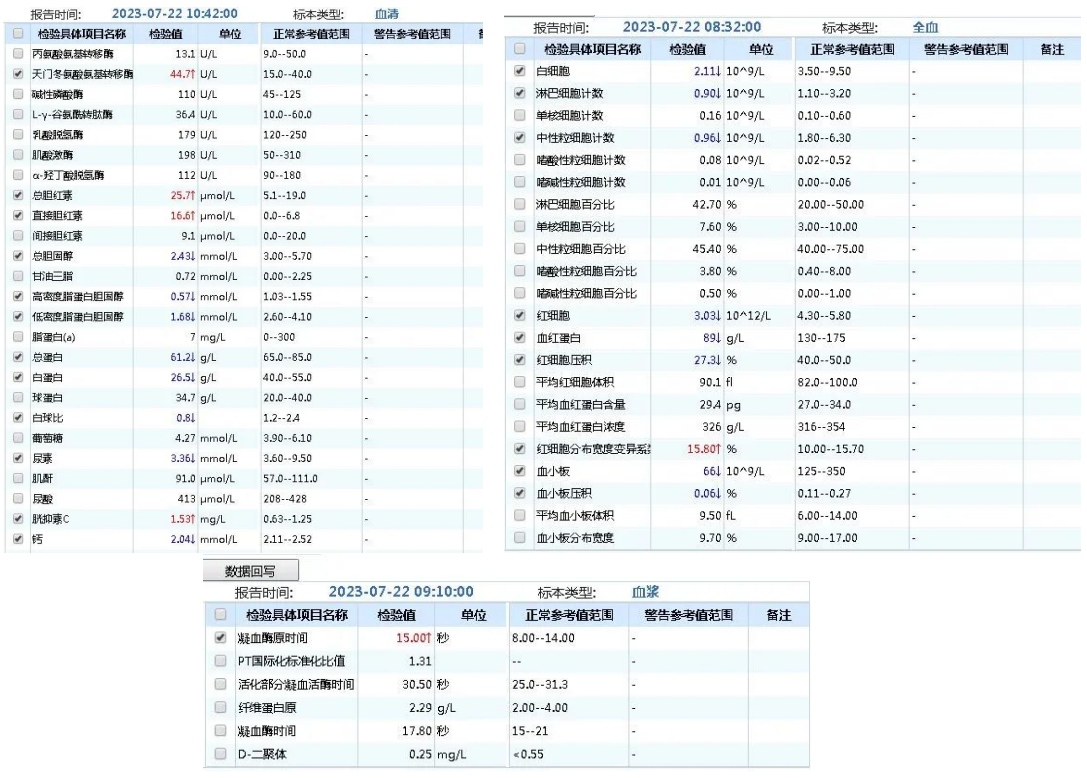 患者无特殊不适,反应尚可,计算力较前恢复。神志清,精神可,皮肤黏膜、巩膜无黄染,无肝掌,可见蜘蛛痣。全身浅表淋巴结无肿大,心肺听诊无特殊。腹部正常,无压痛及反跳痛。Murphy征阴性,肝脾肋下未触及,移动性浊音阴性,双侧肾区无叩痛,双侧下肢无水肿。
