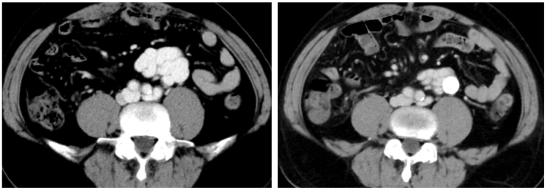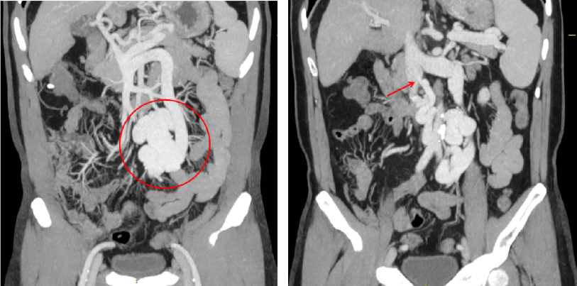 2023-08-10 多排CT全腹部直接增强:肝硬化,脾大,门静脉纤细,食管胃底静脉曲张、异常分流道(肠系膜下静脉-下腔静脉分流,引流端近下腔静脉肾静脉分叉处)