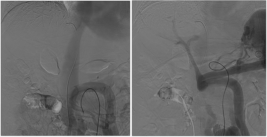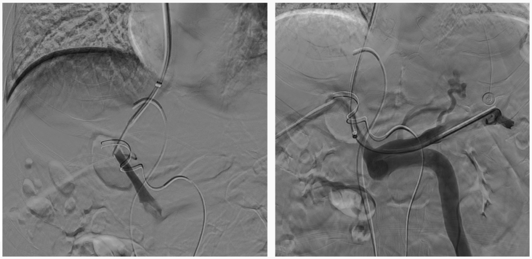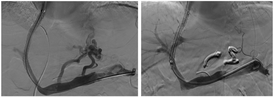 异常分流道栓塞后,再次行门静脉造影,血流呈向肝状态,食管胃底曲张静脉较前更显著,微导管超选至曲张的胃冠状静脉,予以弹簧圈及25%生物胶栓塞,造影示曲张静脉消失,肝内门脉显影较术前显著改善