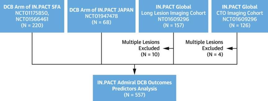这项回顾性分析数据来源于针对接受IN.PACT Admiral紫杉醇涂层DCB(美敦力)治疗的症状性股腘动脉PAD患者的随机临床试验(RCT,包括IN.PACT SFA试验、IN.PACT SFA II试验和MDT-2113 SFA Japan试验)以及多中心IN.PACT Global临床试验中2个预先指定的影像学队列(图2),共涉及83个地区和17个国家。RCT比较了IN.PACT Admiral DCB和PTA的结果。IN.PACT Global为针对IN.PACT Admiral DCB的真实世界研究。
