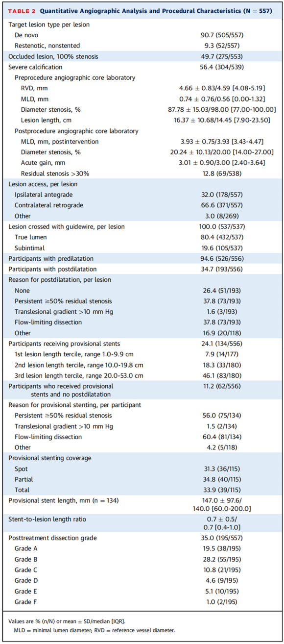 手术特征:术后平均最小管腔直径为3.93±0.75 mm,平均即刻管腔获得3.01±0.90 mm。12.8%的受试者术后有>30%的狭窄残留。94.6%受试患者进行了预扩张,34.7%后扩张。24.1%植入临时支架。在134名植入临时支架的患者中:56.0%的患者持续残余狭窄≥50%,1.5%的患者跨病变压力差持续>10 mm Hg,60.4%的患者存在限流夹层。