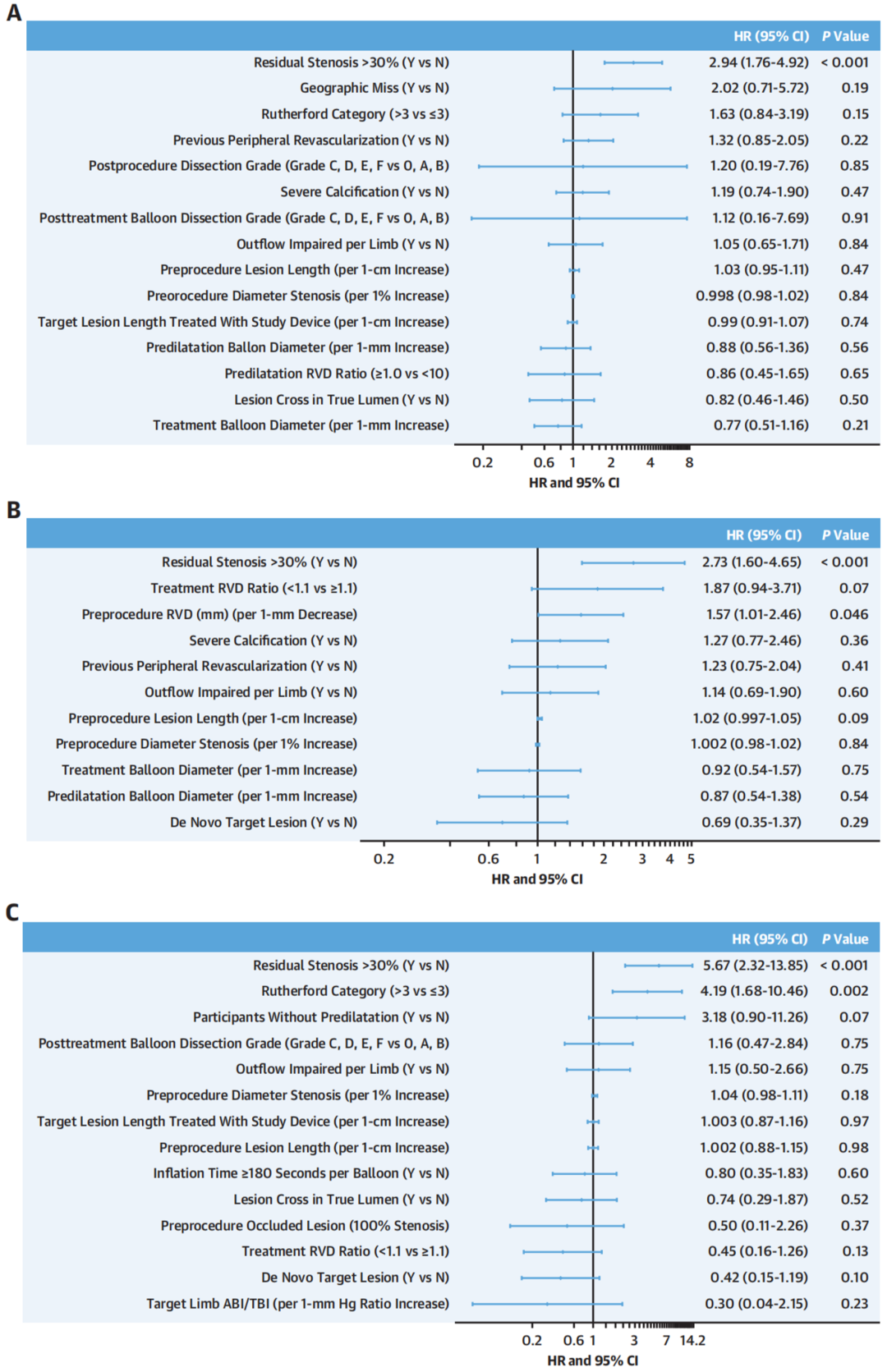 图3. 通畅率丢失(A)、双侧再狭窄(B)和CD-TLR(C)的预测因素