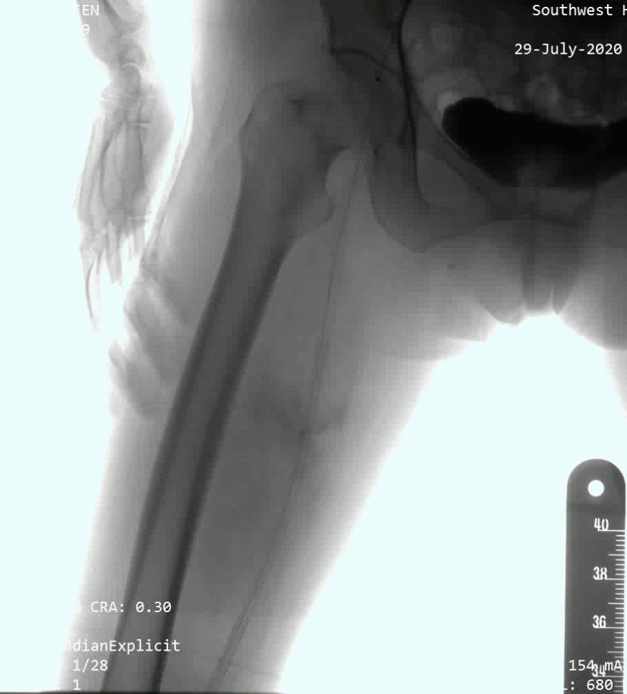 病例2:为股浅长段CTO病变,术中多次尝试,开通极其困难,使用Connect Flex导丝后顺利通过闭塞段。