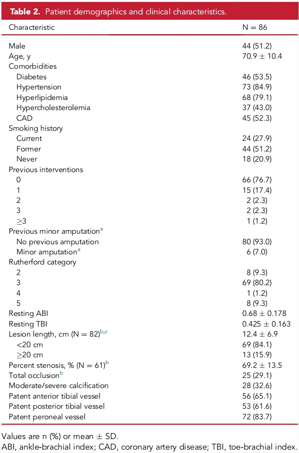 这是一项前瞻性、单臂、国际研究,于2015 年10月至2018 年4月在23个研究机构招募患者。SFA中ISR或闭塞≥50%、Rutherford 2-5级、至少有1条通畅的流出道的患者符合条件。