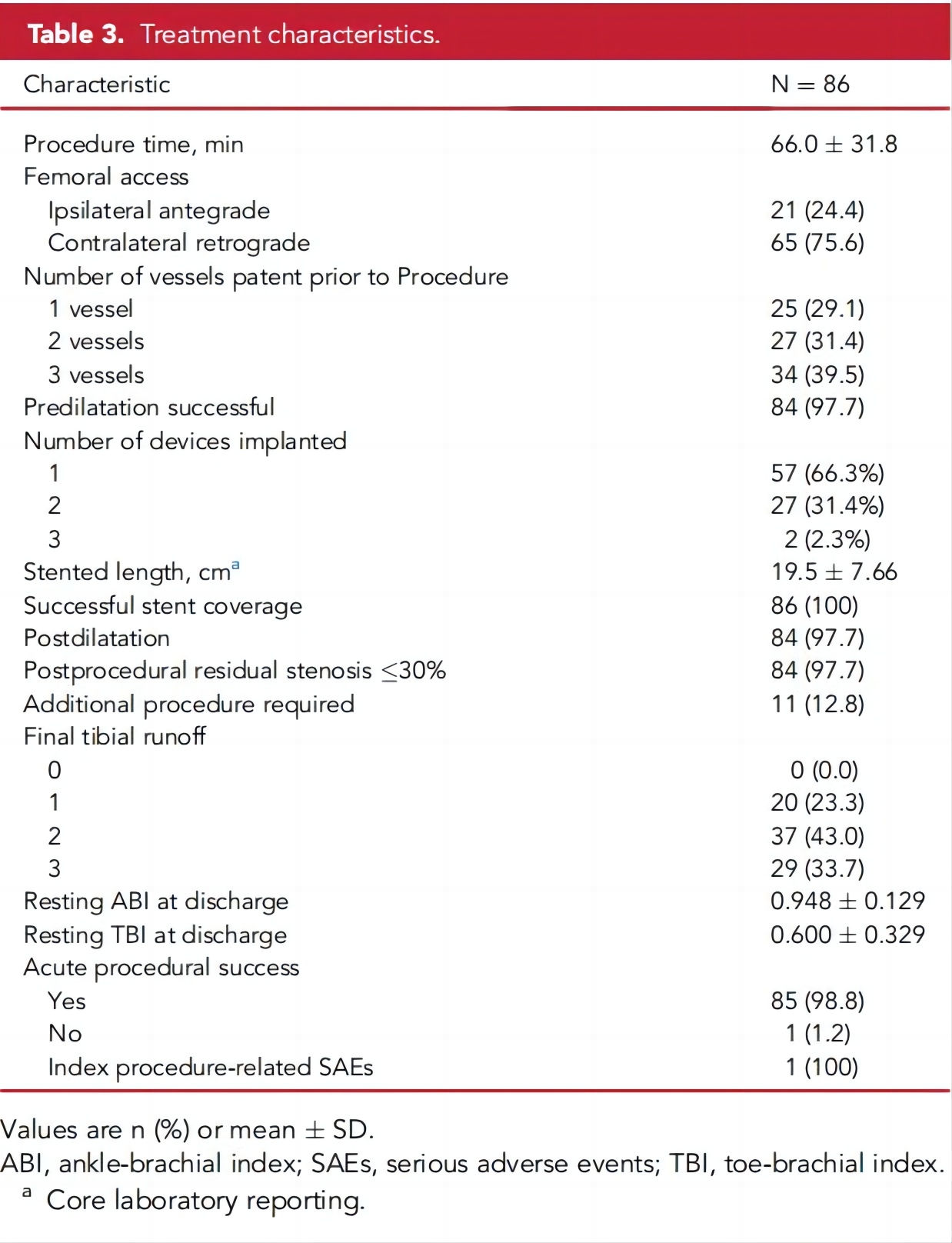 共登记了 108 名患者,其中 86 名患者接受了为期 3 年的分析(平均年龄为 70.0±10.4 岁;48.8% 为女性)核心实验室报告的病变平均长度为12.4±6.92厘米(29.1%闭塞);10.5%出现慢性肢体缺血,81.9%的病变为Tosaka Ⅱ或Ⅲ型。手术技术成功率为 98.8%。30天内,96.5%的患者未发生与器械或手术相关的SAE。