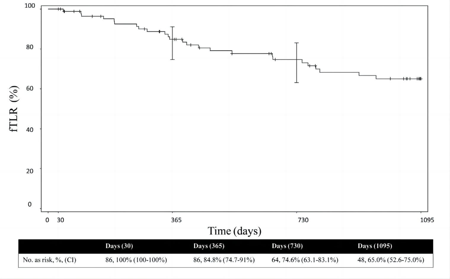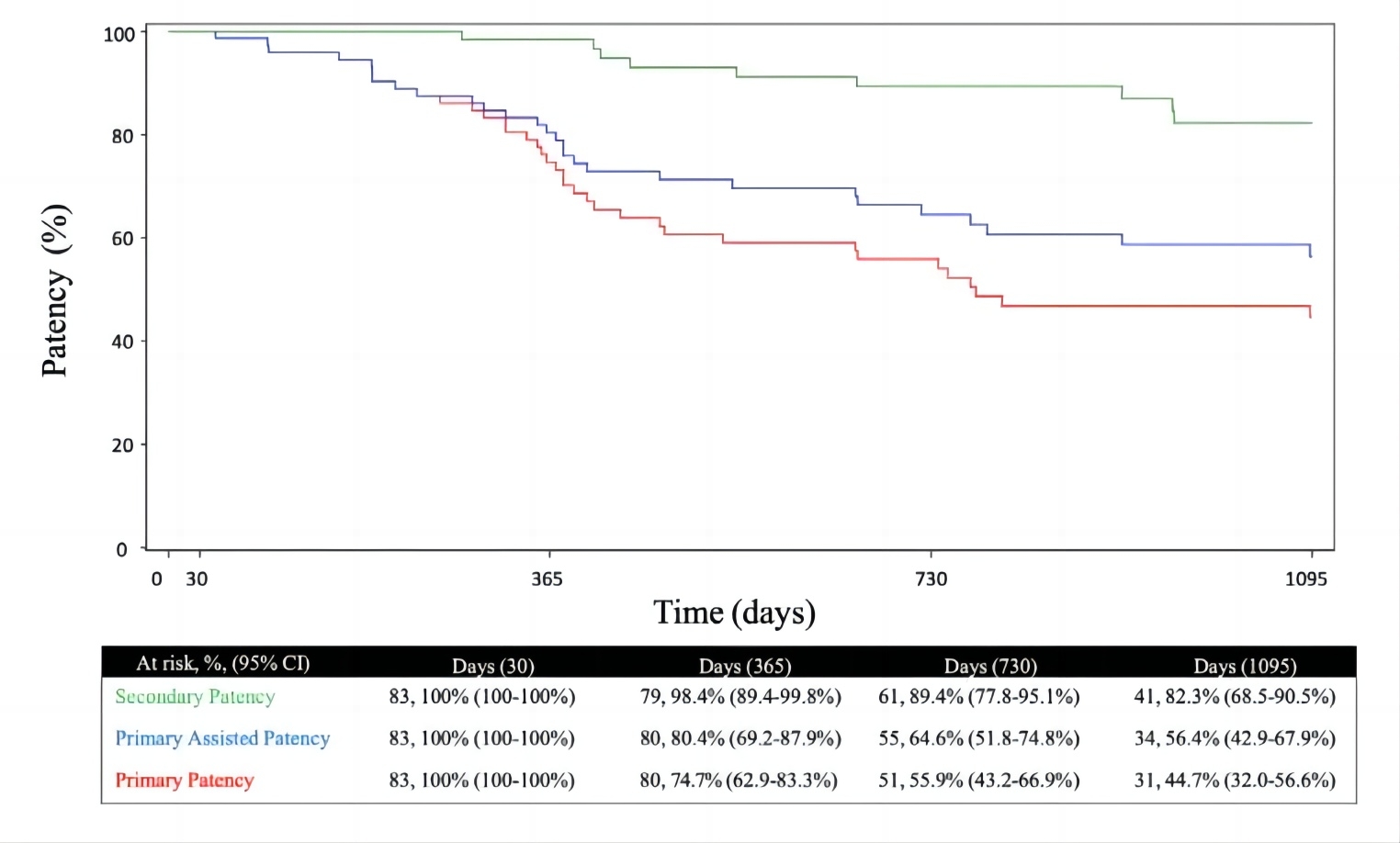 在1年、2年和3年的时间点,初次通畅率分别为74.7%、55.9%和44.7%,初次辅助通畅率分别为80.4%、64.6%和56.4%,二次通畅率分别为98.4%、89.4%和82.3%。1年、2年和3年时,免于靶病变血运重建率分别为84.8%、74.6%和65.0%,其中9例患者在36个月内转为旁路手术。根据核心实验室的评估,3 年内未发生重大截肢或器械故障。