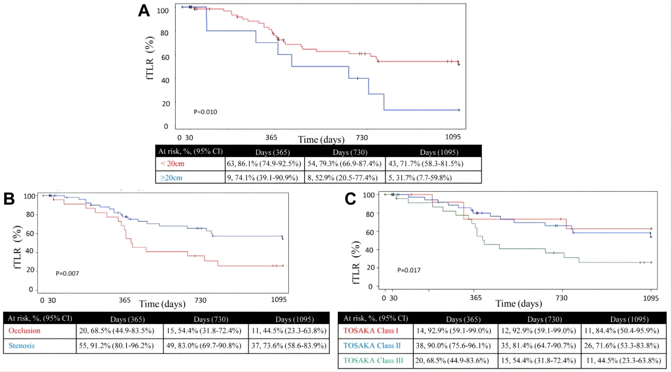 按解剖特征分层的免于靶病变血运重建率Kaplan–Meier分析(A)病变长度;(B)疾病严重程度;(C) Tosaka分类