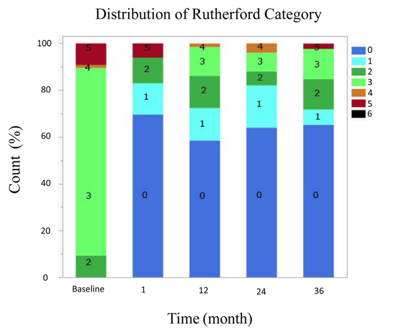 在30天、12、24和36个月的随访中,ABI评分较基线(0.68±.178)的平均分数改善0.329、0.238、0.212和0.243(P<.001)30天时92.7%的患者Rutherford分级改善≥1级,12个月时87.7%患者Rutherford分级改善≥1级,24个月时86.0%患者Rutherford分级改善≥1级,36个月时80.4%患者Rutherford分级改善≥1级。