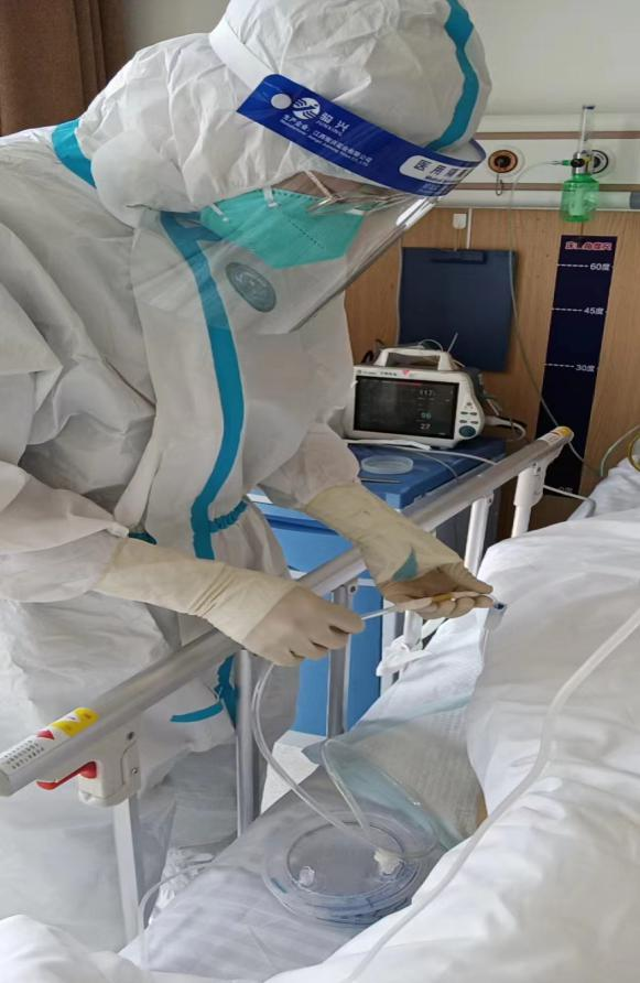 15病区大多数病人需要留置胃管鼻饲饮食,置胃管后如何判断胃管是否在胃内成了焦点。大白与面屏的限制,用传统的听诊方法辨别“气过水声”变得很困难,单单依据回抽胃液判断又有一定的弊端。队员杨青龙凭借自己的呼吸重症超声技能,使用超声两步法观察食道内是否存在双轨征,从而判断胃管是否在正确位置,解决了临床上的一大困难,受到了医生和患者的认可。