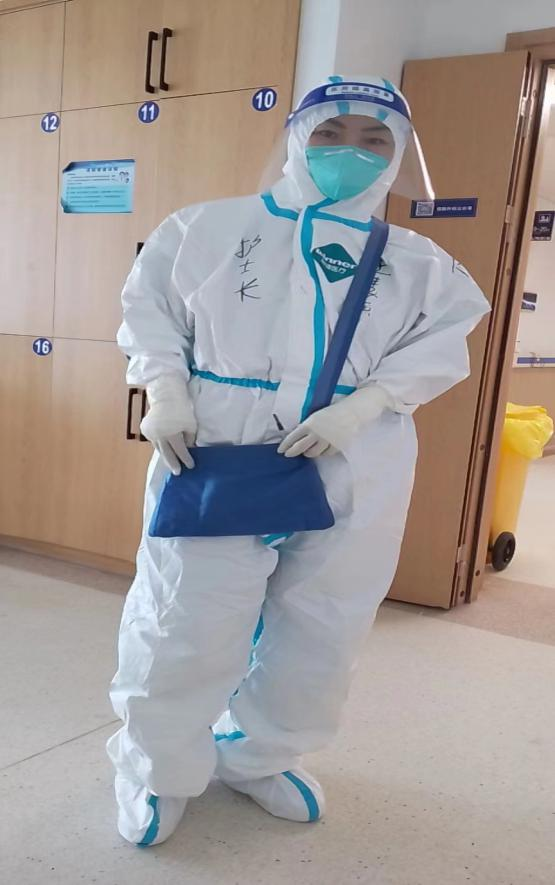 李育玲主任在病房督导中发现大家身着防护服,没有口袋装必要的工作物品,为工作增加了好多不便。为解决这一困难,李主任回到驻地后创意的将一次性隔离衣作为原材料制作了“大白工作专用口袋”,小巧又方便,小物品却为工作带来了大便利!