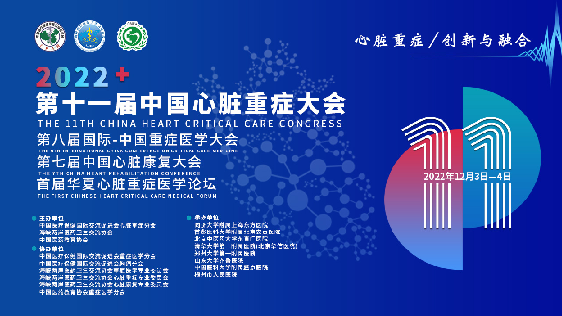 2022年12月3-4日,由海峡两岸医药卫生交流协会心脏康复专委会、中国医疗保健国际交流促进会心脏重症分会、中国医药教育协会主办,同济大学附属上海东方医院、首都医科大学附属北京安贞医院、北京中医药大学东直门医院、清华大学第一附属医院(北京华信医院)、郑州大学第一附属医院、山东大学齐鲁医院、中国医科大学附属盛京医院、梅州市人民医院共同承办的“2022年第十一届中国心脏重症大会”以线上形式成功召开。