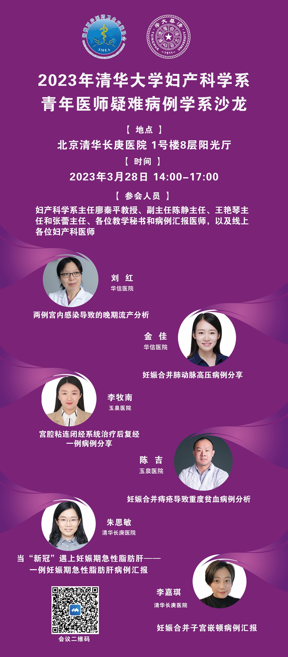2023年3月28日,清华大学妇产科学系迎来了三年“战疫”过后的第一次线下盛大相聚,成功举办了本年度第一次清华大学临床医学院妇产科学系青年医师疑难病例学习沙龙。在本次活动由海峡两岸医药卫生交流协会妇科专委会主办,由北京清华长庚医院以及北京华信医院、清华大学玉泉医院这三家清华大学附属医院的共同发起。海峡两岸医药卫生交流协会妇科专委会主任委员、北京清华长庚医院妇产科主任廖秦平、北京华信医院妇产科主任陈静、玉泉医院妇产科主任王艳琴、北京清华长庚医院妇产科副主任张蕾、北京清华长庚医院妇产科教授黄振宇等出席会议,本次学习沙龙以线上线下结合方式举办。
