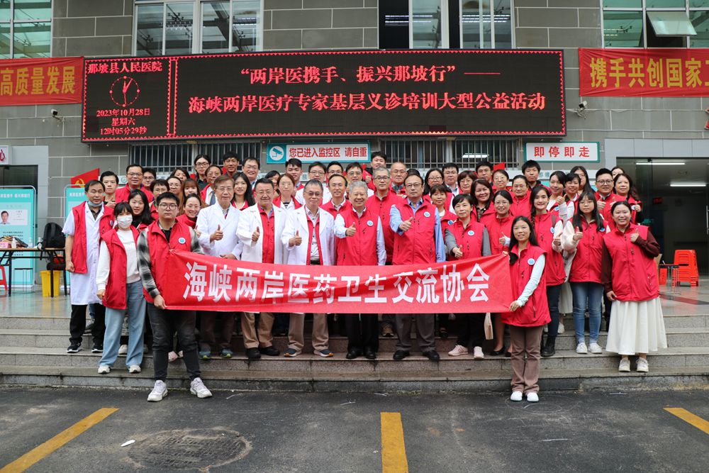 2023年10月28日,为贯彻中央新时期乡村振兴工作部署,发挥协会在资源、技术和人才等方面的优势,在国家卫生健康委港澳台办的指导和广西壮族自治区卫生健康委的支持下,海峡两岸医药卫生交流协会组织动员台湾中华华夏医师协会、北京清华长庚医院、北京中医药大学东直门医院、厦门长庚医院、四川省人民医院、广西医科大学第一附属医院、广西右江民族医学院附属医院等单位,在广西自治区百色市那坡县举行“两岸医携手,振兴那坡行” 大型公益义诊和培训帮扶活动。海峡两岸26名临床专家及18名台湾籍医学生,其中台湾专家9人参加了义诊和讲学活动。